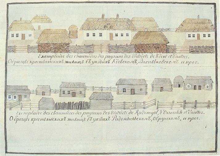 Селянські житла в Київській губернії скрізь збудовані з дерева, вони, як правило, теплі взимку. Їх зовнішнє й внутрішнє планування всюди майже однакове 4. У Київському повіті майже всі хати вкриті соломою, і якщо покрівля не стара, вона не протікає, краще захищає від холоду і спекотного сонця, ніж покрівлі з дощок, черепиці та металевих листів.