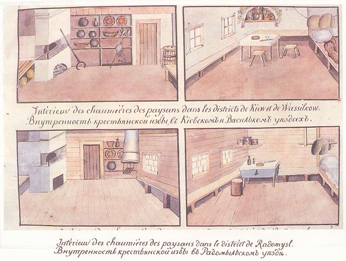 У їхніх помешканнях зовсім немає меблів 14, хіба що іноді шафа і декілька простих стільців. Для їжі вони користуються простим мальованим глиняним посудом. Та в деяких селах, розташованих неподалік від міст, а особливо поблизу Києва, у багатьох селян я бачив гарні фаянсові тарілки, виставлені як окраса, напоказ у шафах, я також часто бачив склянки та карафки з білого скла. Ложки, якими вони користуються, виточені з дерева, відполіровані, вкриті лаком і також складені рядочком у шафі. Виделки їм майже невідомі.