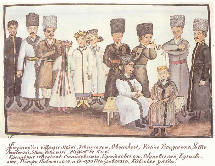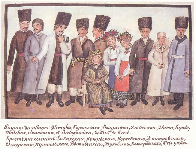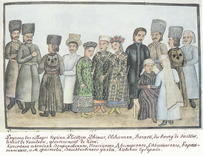 Селяни Київського і Васильківського повітів носять досить високі шапки круглої форми 16 з чорної або сірої овчини, у Черкаському ж повіті їх роблять із шкури кримського ягняти 17, вона здебільшого гарна і дорога; але в Радомишльському повіті у товариствах Шепеличі, Варовичі і Максимовичі 18 селяни носять шапки трикутної форми 19 з сірого або біло-блакитного сукна, прикрашені вишивкою з голубої або темно-червоної вовни. Волосся в них підстрижене досить коротко, майже всі мають вуса, дехто, особливо старі, носять бороду.