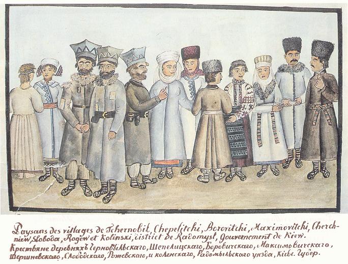 Всі вони одягають сурдути 20, які називають свитками 21, вони пошиті із грубого темно-коричневого, іноді сірого чи білого сукна 22, виготовленого ними самими з вовни своїх овець. Свитки досить добре захищають від дощу, вони широкі, звичайно, довгі, позаду в них каптур, у якому спереду є два прорізи для очей 23; його натягують на голову, щоб захиститись од дощу й вітру в негоду. Під час подорожі цей каптур часто відіграє роль торбини: у нього кладуть хліб. У Черкаському повіті заможніші селяни і особливо молодь носять свитки з синього, досить тонкого сукна (купленого у сусідніх мануфактурах), прикрашені золотими або томпаковими 24 нашивками.