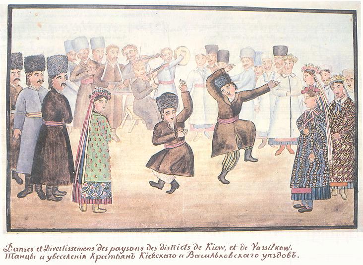 Взагалі, я помітив більше порядку в одязі і навіть елегантності у селянок, які мешкають поблизу міст, а особливо біля Києва, Василькова, Черкас і Звенигородки. Чоботи жінки і дівчата носять майже завжди, особливо у святкові дні. Заможні мають чоботи з червоної або жовтої шкіри, а у Хотівському, Обухівському, Петро-Павлівському і Кожухівському товариствах вони носять обшиті червоною шкірою черевички та сині панчохи.
