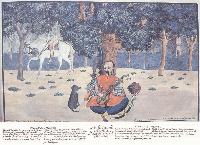 Серед народу поширена також розповідь про розбійника на ім’я Мамай, зображення якого зустрічається у багатьох хатах 135. Він сидить під дубом, грає на бандурі (вид гітари), віддалік на дереві висить чоловік, а внизу написані такі слова: