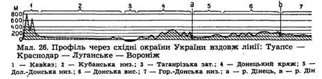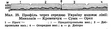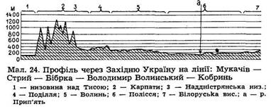 Характеристичною рисою смугового укладу рельєфу України є те, що, за винятком зах. частини укр. земель, низовини непомітно, поступово переходять у височини, а далі круто й нагло спадають до наступної низовини, яка, в свою чергу, знову підноситься і знову обнижується. Ці зміни рельєфу добре видно на поданих тут профілях (мал. 24 — 26).