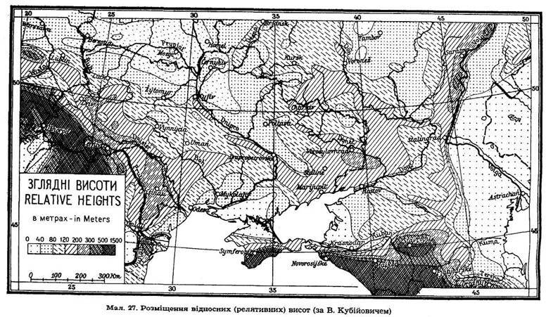 Відносні висоти (див. мал. 27). Розчленування рельєфу українських земель, тобто різниці висот між найвищими і найнижчими точками (відносні, або релятивні, висоти) — в різних частинах укр. земель різні.
