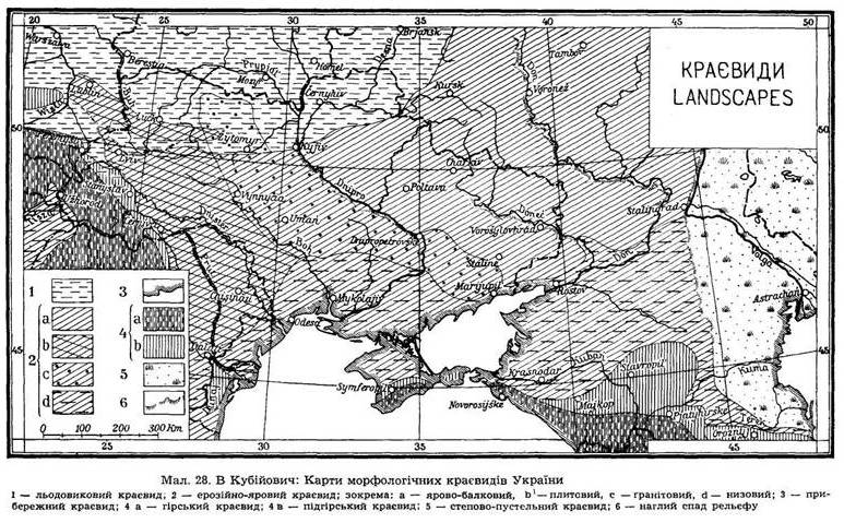 Література: Крубер А. А. Физико-географические области Европ. России. Землеведение 14. Москва 1907; Рудницький С. Знадоби до морфології сточища Дністра. Зб. Мат.-Прир.-Лік. Секції НТШ, Львів 1905, 1907, 1913; Тутковський П. Природна районізація України. Київ 1922; Лычков Б. А. Естественные районы Украины. Изд. Центр. Стат. Упр. УССР 1922; Дмитриев М. И. Геоморфологическое положение й орография Украины. Харьков 1928; Лычков Р. Некоторые черты геоморфологии южного Полесья. Геог. Ком. Ленинград 1929; Полянський Ю. Тераси, леси й морфологія Галицького Поділля над Дністром. Львів 1929; Соболев Д. Н. Эскиз геоморфологии Украины. Москва 1929; Rudnyckyj S. Beiträge zur Morphologie des Dnipro-Gebietes in der Ukraine. Z. Ges. f. Erd. Berlin 1931; Дмитріїв М. Рельєф УРСР. Харків 1936; Гладцын И. Н. Геоморфология СССР ч. І. Ленинград 1939; Кубійович В. Рельєф українських земель. Географія України й сумежних країв. Краків-Львів 1943; Пашкевич С. Морфологічні краєвиди українських земель. Географія України й сумежних країв. Краків-Львів 1943.