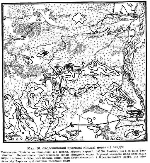 Краєвид кінцевої морени (див. мал. 30, 31). В околицях Володави, озера Свитязь, на південь від Любомля, біля Ковеля, Чорторийська, уздовж правого берега Стиру і лівого берега Горині, а далі біля Овруча виступає т. зв. краєвид кінцевої (чолової) морени. Це вже краєвид більш розчленований, бо з рівних і забагнених просторів підіймаються досить високі, отже досить різко позначені на поверхні горби, збудовані з моренових відкладів різного петрографічного складу. Горби ці тягнуться звичайно один за одним вигнутими рядами. Між горбами, що є звичайно вододілами тутешніх річок, розташовані широкі річкові долини й болота. В деяких місцях краєвиду виступають ще т. зв. ози, тобто горбовинні вали, що йдуть рівнобіжно і вказують колишній напрям льодовика.