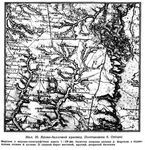 Найхарактеристичнішими рисами цього краєвиду є балки й яруги. Їх постанню особливо сприяє грубий покрив лесу, як і сипкі, крихкі породи, що лежать під шарами лесу, континентальне підсоння й первісно степовий рослинний покрив. Найвиразнішою рисою ярово-балкового краєвиду є асиметрія річкових долин і міжрічкових площ, яка на загальному вигляді краєвиду позначається так: правий берег річкової долини стрімким косогором спадає круто до ріки (див. мал. 34). Сам косогір розмитий балками і проваллями. На лівому березі ріки лежить широка заплавна площа з болотами, старицями і підмоклими левадами. На терасах, що лежать уже понад заплавною площею, часто виступають навіть кучугури. Найвищі тераси вкриті грубим шаром лесу. Далі від ріки лівий берег лагідно підноситься й непомітно переходить на зовсім рівну або лише мало хвилясту міжрічну гряду, яка далі знову стрімко спадає до сусідньої річки, де знову повторюється згадане чергування краєвидних елементів. Вододільні простори утворюють подекуди ідеальну рівнину. Оселі в ярово-балковому краєвиді розміщені головне на вищих терасах, вкритих лесом, або по річкових долинах. Вододільні безводні простори звичайно без осель.