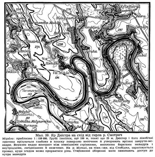 Ріки, що течуть до півдня Поділля, щораз більше врізуються в підложжя, схили долин стають дедалі крутіші, спад рік зростає нерівномірно, і тому навіть з’являються шипоти і водоспади; долина набирає вигляду яру (кеньйону). Найглибший і найкращий яр Дністра, круті схили якого доходять аж до 150 — 200 м понад дно долини (див. мал. 39, 40). Дністер і його подільські притоки творять врізані закрути, меандри. Цілком відмінно від глибоких ярів, із їх молодими сміливими формами, межиріччя плоскі, слабо хвилясті.