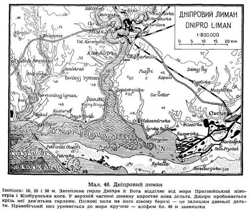 Півн.-зах. узбережжя Чорного моря має /78/ берегову лінію досить вирівняну. Тільки там, де більша чи менша річка або хоча б степова балка сходить до моря, круча стрімкого берега переривається, і утворюються прибережні озера, відділені від моря тонкими косами, — це лимани (див. мал. 46, 57). Більші ріки, Дністер. Бог. Дніпро, розбивають прибережні наноси й гирлами вливаються в море. Менші ріки не мають сили перемогти акумуляційної діяльности моря, і лимани цих річок замкнені від моря суцільними косами-пересипами.