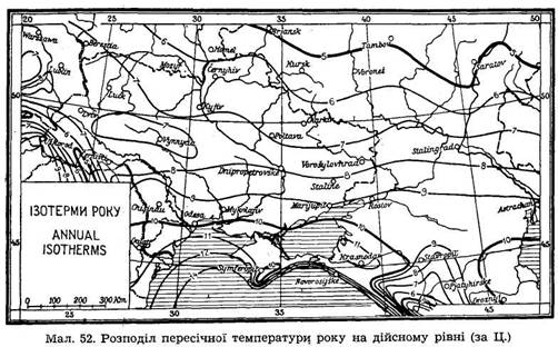 Перебіг ізотерм січня й липня характеризує водночас різницю між ними, або амплітуду, яка зростає від 23° на заході і 21° над Чорним морем до 32° на сх. межах укра“н:ької території.