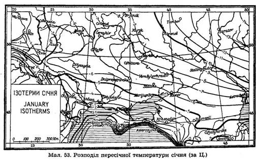Ізотерми січня проходять у зах. і півн. Укра ні, себто на півн.-зах. від осі барометричного максимуму, в південниковому напрямі, отже на температуру зими тут не має впливу географічні широта, а лише відстань від Атлантійського океану. Температура знижується в напрямі із заходу на схід із — 4 ° Ц. до — 9 ° Ц. В півд.-сх. Україні ізотерми проходять майже рівнобіжниково, тобто з півн.-зах.-заходу на півд.-схід-схід, отже, на температуру степової України впливає насамперед географічна широта, а вплиз Атлантики тут другорядний.