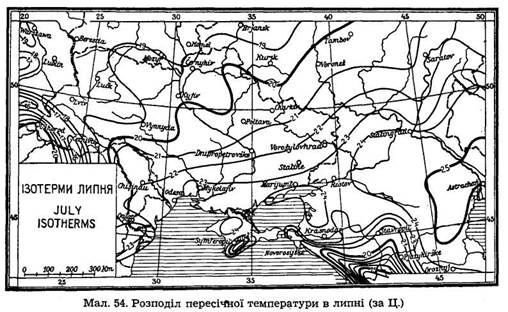 Україна лежить у поміркованій смузі півн. півкулі на значній віддалі від Атлантійського океану, в сусідстві великого континенту Азії. Тим то температура повітря меншає не лише з півдня на північ, але зимою й з заходу на схід, а літом схід України дещо тепліший від заходу. Це збільшення континентальности в сх. напрямі видно із зростання /83/ амплітуди, себто різниці між найтеплішим і найхолоднішим місяцем у сх. напрямі. Так, пересуваючись уздовж одного рівнобіжника, напр., 50°, на схід, знаходимо загальне зниження температури року, ріст температури літа і зниження температури зими, ріст амплітуди і зменшення суми атмосферних опадів.