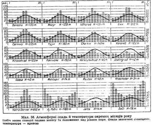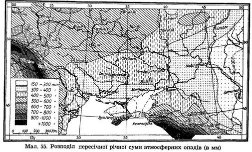 Атмосферні опади. Розподіл річної суми атмосферних опадів зображений на карті (мал. 55). В рівнинних областях вона міняється від 300 до 700 мм, при чому пересічна річна сума зменшується в напрямі на півд. схід. Понад 500 мм опадів має півн. і зах. Україна; на південь від /86/ барометричної осі число опадів гостро зменшується. Причорноморська низина дістає їх ледве бл. 300 мм, а Прикаспійська депресія навіть менше як 250 мм. В горах сума атмосферних опадів велика — в Карпатах до 1500 мм, а на зах. схилах Кавказу бл. 2000 мм.