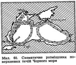 Крім подвійних течій, на Чорному морі під впливом північних вітрів виступають ще поверхневі течії, які творять два замкнені кільця, одно з них — зах. чорноморське, друге — сх. чорноморське (див. мал. 60).