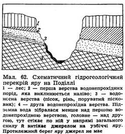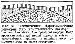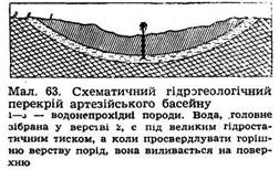 Підземні води, або підґрунтові, діляться на дві основні групи. Перша група — це власне ґрунтові води, або т. зв. зашкірна вода, що тримається в товщі поверхневих покладів і звичайно використовується в відкритих шахтних колодязях; вона часто занечищена й мало придатна до пиття. Друга група — це т. зв. верствові, глибинні води, (див. мал. 63), що тримаються в глибинних верствах породи й часто мають покриття з водонепроникливих порід, які зумовлюють чималий тиск цих вод (напірні, або артезійські, води). Наявність і багатство підземних вод залежить і від кліматичних, зокрема опадових, умов і від геологічної будови даної области. Залежно від змін обох факторів, укр. землі можна поділити на кілька гідрогеологічних районів.