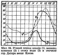 опадів, випаровування і стоку для гор. Дніпра подає мал. 64. Крім змін впродовж