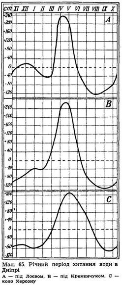 Зміни в сумі опадів, випаровування і стоку позначаються передусім на водостані наших рік. Усі наші ріки мають виразний річний хід змін водостану (див. річний період коливань рівня води в Дніпрі — мал. 65). Найвищий стан води відзначений на весні, коли до рік стікають води з талих снігів. Максимум у гор. бігу виступає в березні або квітні, в дол. течіях пересувається на травень. Мінімум настає під час найсухішого періоду, тобто восени (VIII, IX і X), а другий мінімум взимку (XII, I або II), коли випадає сніг, а ріки живляться тільки ґрунтовими водами. Між осіннім і зимовим мінімумом помітний ще невеликий ріст водостану перед приходом зими, коли низька температура ослаблює випаровування і добрих 3/4 атмосферних опадів іде до рік. У гірських рік (Дністер, Кубань) відзначений другорядний літній максимум, спричинений високими літніми опадами й таненням снігу в високих горах.
