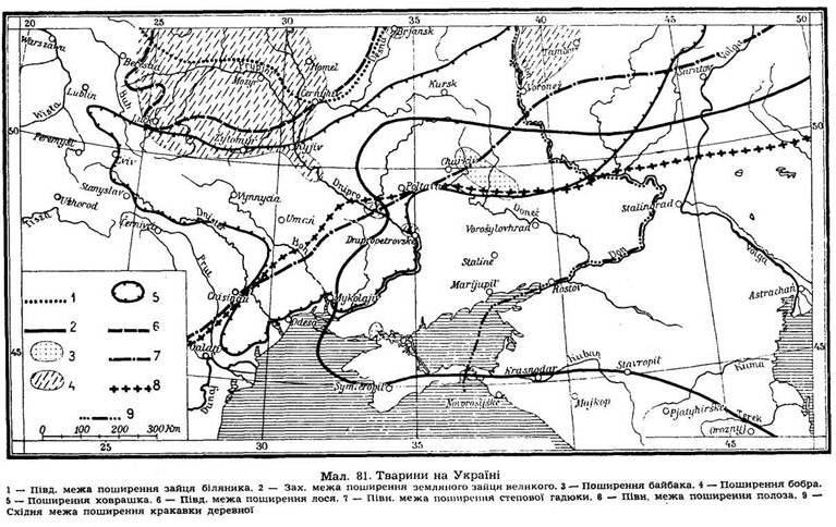 На будові і розміщенні фавни лісостепу яскраво відбивається переходовий і окраїнний характер нашої природи. Західні види, характеристичні для наддністрянського району лісостепу, — це ховрашок західньоевропейський (Citellus citellus L ), трав’янка (Saxicola torquata rubicola L.), також горихвістка чорна (Phaenicurus ochrurus ater Brehm.). По лісах балок і ярів зустрічається ще дикий кіт (Felis silvestris). Далі на схід, між Богом і Дніпром, можна знайти багато західніх видів птахів, зате серед гризунів переважають уже типово степові види, як ховрах (Citellus meridiooccidentalis Schreb.) і рясоніжка звичайна (Neomys fediens fediens Schreb.). З південних степів сюди заходить характеристичний вид крота (Talpa europea Brauneri Sat.). Ще далі на схід у Дніпро-Донецькому районі з’являються вже виразно східньоевропейські, а то й азійські види тварин, з яких найтиповішим є рясоніжка велика східня (Neomys fediens leptodactylus) і великий заєць земляний (Alactaga jaculus Pall.). Місцевою формою є тут ховрашок рябий (Citellus suslicus averini Mig.). На річкових заплавах гніздиться кулик болотяний (Tringa stagnatllis Bechst.) і гуска сіра (Anser anser L.). Степова фавна. На степах українського півдня в зв’язку з браком лісів немає типово лісових видів, як білки, куниці лісової, дятлів і синиць, що їх знаходимо в лісостепі. До складу степових біоценоз (життєвих спільнот) входять тут як типові представники із ссавців тхір степовий (Putorius Eversmanni Less.), а передусім перев’язка (Vormella peregusna Pall.), ховрашок сірий (Citellus pygmaeus Pall.), повх степовий (Microtus socialis Pall.) та інші, згадані в описі фавни лісостепу. З птахів весною над цвітучими степами літають два роди жайворонка: жайворонок степовий (Melanocorypha calandra) і жайворонок малий (Calandrella brachydactyla). Швидка хохітва східня (Otis tetrax orientalis Hart.) і боязкий журавель степовий (Antropoides virgo L.) — це найбільші птахи цієї смуги. Плиска чорноголова (Motacilla Kaleniczenkai Kal.) і вівсянка чорноголова своєю рухливістю оживляють монотонний краєвид безкрайого степу.