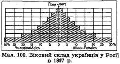 Вік і стать людности в 1897 р. Цілі десятиліття аж до вибуху першої світової війни вікова будова української людности великих змін не зазнавала. Як вона виглядала на підросійській Україні в 1897 p., подає діяграма (мал. 100). Вікова піраміда 1897 р. вказує на великий відсоток наймолодших річників, який швидко меншає вгору, себто число дозрілих річників відносно мале. Така вікова піраміда характеристична для народів із великим числом народжень і великою смертністю. В 1897 р. вона була у нас, як і в інших народів Сх. Европи, відмінна від народів Зах. Бвропи, напр., Німеччини з її поміркованим числом народжень і смертности, а ще більше — Франції з її малим числом народжень. Це видно з порівняння (у відсотках всього населення):