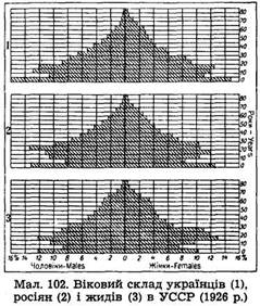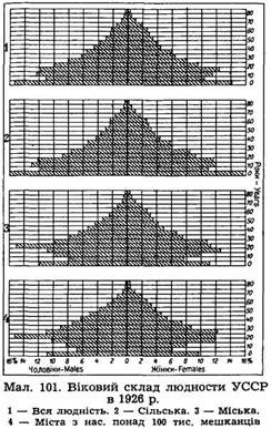 Вік і стать людности в 1926 р. Подану вище вікову й статеву будову дуже захитали воєнні та революційні роки. З вікової піраміди (див. табл. і мал. 101 — 102) ми бачимо зменшення річників, народжених під час війни, себто групи 5 — 9 років, і захитання рівноваги між відсотком чоловіків і жінок віком понад 25 років, через велику втрату чоловіків на війні. Таку вікову будову виявляють усі народи, які брали участь у війні, з тим, що на неї, — як і в нормальні часи, — впливають ще число народжень і смертність.