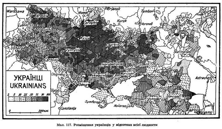 Розміщення українців (див. мал. 117). Українці на своїй етнографічній території розміщені нерівномірно. Чистою укр. територією, де нац. меншості не досягають і 10%, є основний масив України, який обіймає старозаселені й центральні землі. Цей масив утворює неправильний чотирикутник, що простягається на заході до лінії Могилів — Бердичів — Київ, на сході — до лінії Миропілля (біля Сум) — Харків — Гришине, на півночі доходить до етнографічної межі з білорусами, на півдні досягає степів на лінії Балта — Ольвіопіль (Первомайське) — Запоріжжя — Гришине. Від цього масиву відходить іще чистоукраїнський поліський півострів, що сягає аж по Буг на заході, і другий, східній, від Харкова по Дін. Отже масив України пересунутий на північ, бо доходить на півночі аж до етнографічної межі, а на півдні лежить від неї далеко. Найчистішою частиною України є Лівобережжя; тут на великих просторах українці становлять 99 % усієї людности.