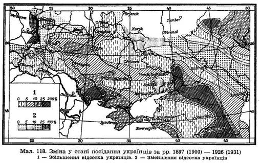 Порівнюючи висліди переписів населення, можна, при всій їх неточності, побачити, в якому напрямі йшла еволюція нац. відносин на Україні аж до часу примусової колективізації й частинної депортації укр. населення з підсовєтської України. Ці зміни показані на карті (мал. 118). /163/