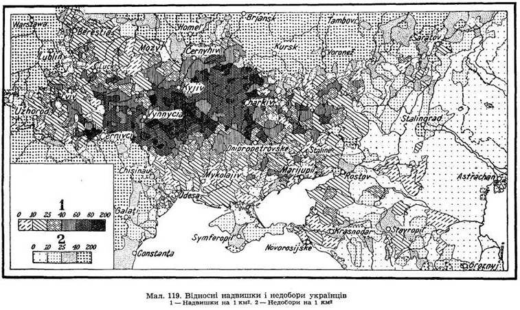 Загальні зауваження. На опанування укр. території українцями впливає не лише величина відсотка, який становлять українці, але й густота населення. Що густіше живуть на якійсь території українці, то сильніше вона закріплена укр. елементом. Що більший відсоток становлять українці й що більша густота людности, то більшу перевагу мають вони над іншими національностями, то більша є надвишка українців над неукраїнцями на 1 км², т. зв. релятивна, відносна надвишка. І навпаки, що менша ця надвишка, то легше змінити нац. стан посідання й то легше при невеликих нац. змінах втратити більшість не на нашу користь (див. мал. 119).