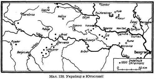 Далеко від суцільної укр. території розкинулися наші колонії в Юґославії. Вони виступають у трьох групах, а саме: в Бачці, в півд.-зах. частині Словенії — у т. зв. Сірмії і в Босні, коло міста Приявора. Українці в Бачці й Словенії — це лемки з Закарпаття, що їх оселила тут у кінці XVIII ст. австрійська влада в майже пустельній, зруйнованій турецькими наїздами країні. Їх мова — окрема говірка з словацьким забарвленням, але нац. почуття їх українське. Українці в Босні оселилися в кінці XIX ст., вони походять із Галичини. Разом живе українців у Вачці — 12 тис, у Словенії — 8 тис, у Босні — 9 тис. Важче визначити число українців, що живуть у півн.-сх. частині Угорщини.