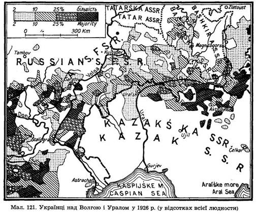 Українці на схід від етнографічної території. За переписом 1926 р. в евр. частині СССР, крім більших островів, жило 440 тис. українців, в тому числі на Курщині — 170 тис, на Вороніжчині — 69 тис, на Донщині — 79 тис, по міських осередках: у Москві — 16 тис, в Ленінграді — 11 тис. /172/