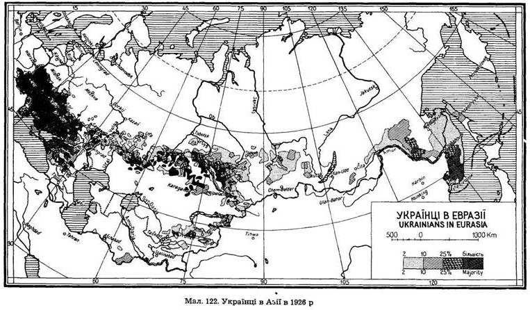 В дійсності — підкреслюємо — число українців і простори, ними заселені, були вже в 1926 р. далеко більші і виявляють тенденції росту. Після 1930 р. і під час другої світової війни до Азії переселено сотні тисяч українців, і лише деякі з них повернулися назад. Частина з них на засланні в полярних концентраційних таборах, частина перебуває »на вільному оселенні« в областях давнього скупчення українців та в нових промислових районах. Сьогодні живе в Азії, мабуть, понад 5 міл. українців. 1)