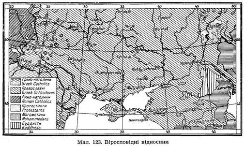 Віросповідні відносини в нас тісно пов’язані з нац. приналежністю. Українці — загалом православні й греко-католики; з нац. меншостей на Україні росіяни, білоруси, греки й болгари — православні, поляки і спольонізовані українці та словаки — римо-католики, румуни — православні й греко-католики, німці — переважно протестанти, меншість — римо-католики, угорці — католики, протестанти і греко-католики, татари, киргизи й кавказькі горяни — мохаммедани, жиди — Мойсеєвої віри, калмики — буддисти.