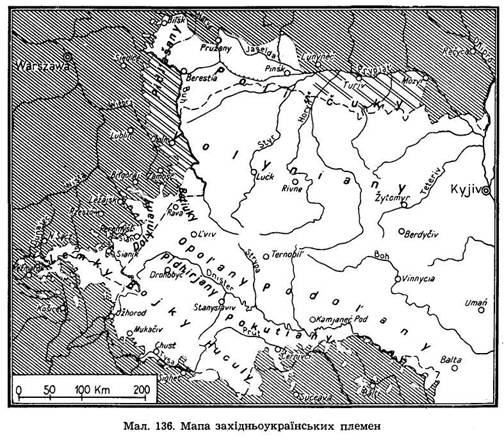 Племінний склад у IX ст. Керівна роля у формації укр. етнічного й державного об’єднання припала невеликому, але сприятливо розміщеному племені полян, що жило над середнім Дніпром довкола старого центру Києва. Далі початковий літопис називає племена деревлян, уличів, або угличів, тиверців, дулібів, а далі білих хорватів, етнічна приналежність яких є досі предметом наукового розгляду (про ці племена докладніше див. Історія). Побіч етнографічних назв зустрічаємо тоді уже частіше політ. та державні означення у зв’язку з пожвавленням державного життя України. Зокрема на місці дулібів з’являються пізніше назви: волиняни і бужани.