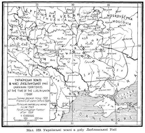 Таким чином на поч. XVI ст. укр. землі були поділені між сусідніми державами: Литвою (Волинь, сх. Поділля, Київщина, півд. Лівобережжя), Польщею (Галичина, Холмщина, зах. Поділля), Московським князівством (Чернігово-Сіверщина), Угорщиною (Закарпатська Україна), Молдавією (Буковина, галицьке Покуття); узбережжя Чорного моря між гирлами Дніпра і Дністра було захоплене турками й татарами (див. мал. 329).
