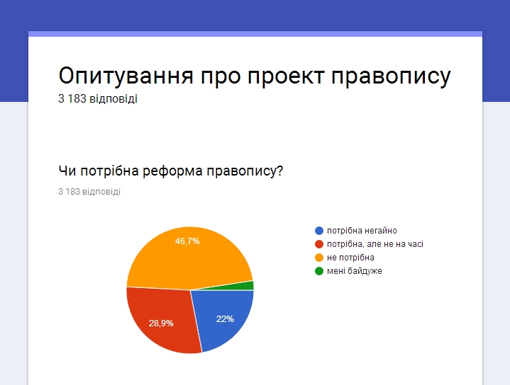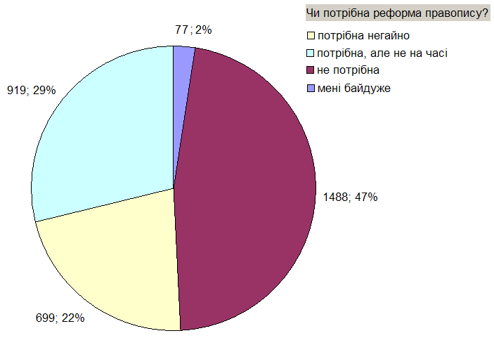 • На питання про те, чи потрібна реформа правопису, відповіді «за» і «проти» також розділилися приблизно порівну. Вважають, що реформа потрібна, загалом 51%; з них лише 22% відповіли, що потрібна негайно, 29% вважають, що потрібна, але не на часі. Майже половина учасників опитування відповіли, що реформа правопису не потрібна — 47%.