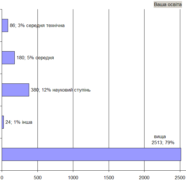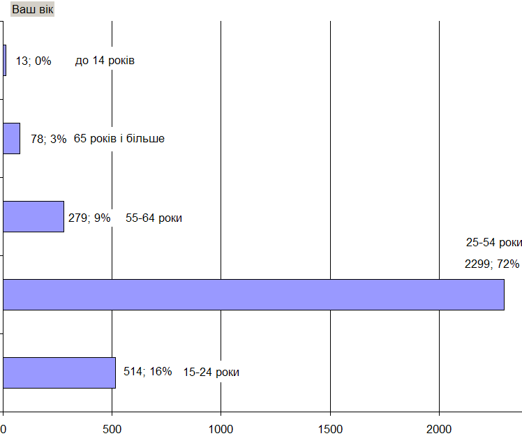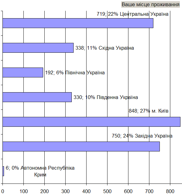 • Учасники веб-опитування територіально представляють усю Україну зі значною перевагою киян (27%) і помітно зменшеним представництвом східних (11%) та південних (10%) регіонів, охоплено всі вікові й освітні прошарки. Дані за регіональним, освітнім та віковим розподілами див. у таблицях нижче.