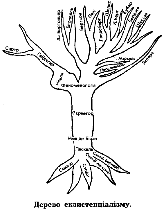 Щоб краще зрозуміти цей рух, подивимось на дерево екзистенціалізму, намальоване Еммануелем Мунтьє (1905 — 1950 pp.) y його «Вступі до теорій екзистенціалізму» (1946 p.). Цей французький філософ, засновник журналу «Esprit» (дух, розум) і одна з центральних постатей «персоналістського» руху, намалював довгу галерею предків екзистенціалізму: Паскаль, який проклав усі дороги і який, надаючи перевагу велінням серця, провістив напрямок думки, що ним пішов сучасний екзистенціалізм, Сьорен К’єркегор, для якого існування є протилежністю абстракції, а гегельянська система означає закритість і смерть, але також і Ніцше, котрий «вибухнув як удар непристойного грому в канікулярному небі «, Ясперс, Габрієль Марсель і чимало інших. Якщо К’єркегор є «офіційним» батьком екзистенціальної мислі, який віддає перевагу категорії індивіда перед нагромадженнями ідей, то дерево екзистенціалізму багате також на розгалужене коріння та гілля.