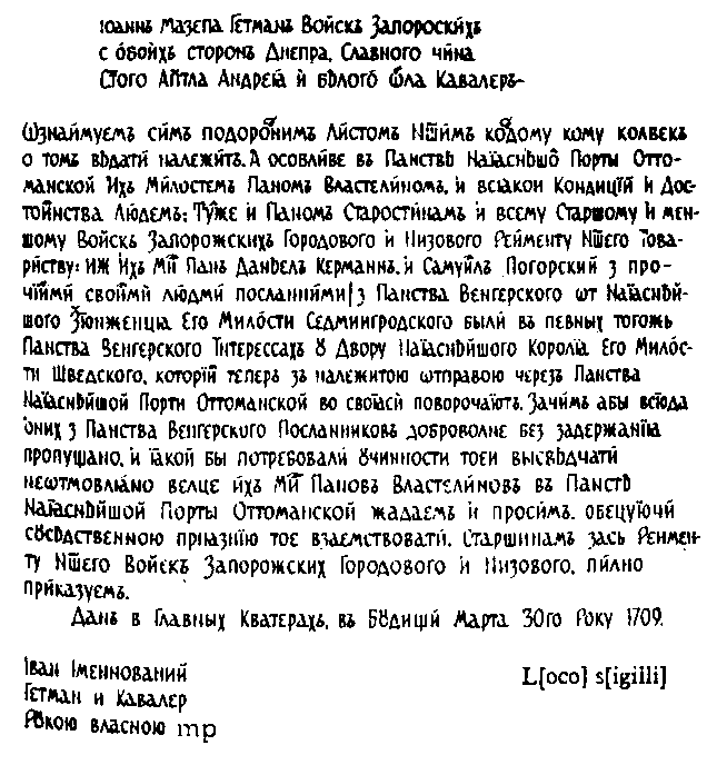 Дано в Головному Штабі, в Будищах, 30 березня 1709 року.