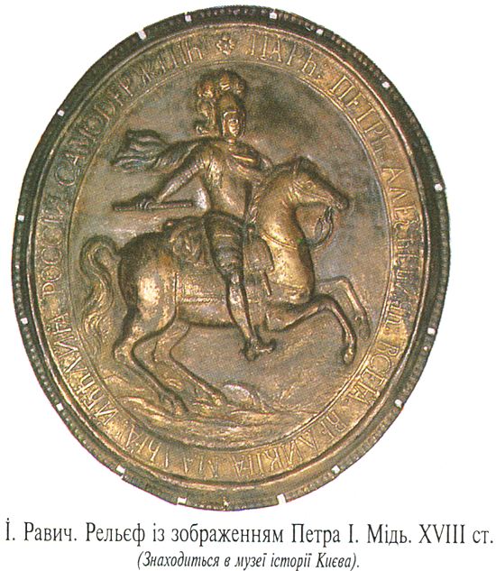 І. Равич. Рельєф із зображенням Петра I. Мідь. XVIII ст. (Знаходиться в музеї історії Києва).