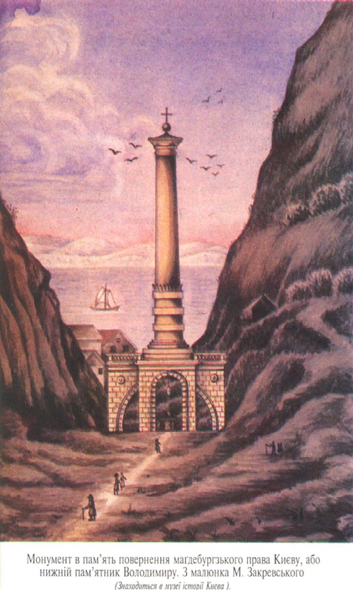Монумент в пам’ять повернення маґдебургзького права Києву, або нижній пам’ятник Володимиру. З малюнка М. Закревського (Знаходиться в музеї історії Києва).