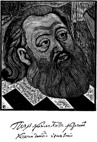 Портрет П. Могили, виконаний на основі фрески в храмі Спаса на Берестові (1644-1645). Внизу його автограф.