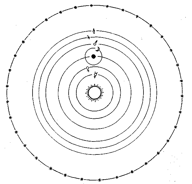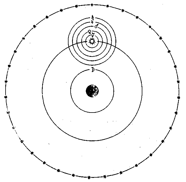 2. Тут можна побачити, що ця система відрізняється від обох попередніх і одночасно дещо запозичує у них. Бо Тіхо, щоб пояснити видимий рух неба, який здається, триває 24 години, пішов за Птолемеєм і помістив непорушну Землю в центрі світу, стверджуючи, що навколо неї обертаються всі небеса зі сходу на захід. А щоб пояснити дійсний рух планет, він погоджується з Коперніком, поміщуючи в центрі Сонце, навколо якого рухаються найближче Меркурій та Венера, далі — Марс, Юпітер, Сатурн. Більшість сучасних філософів прийняла цю систему і саме тому, що вона легше розв’язує чимало складних питань астрономії, і в свою чергу не суперечить Святому письму. Вона є безпечнішою, бо викладена обережніше. Ми ж задовільнимося лише історичним ознайомленням з поглядами астрономів і не вступатимемо /150зв./ в чужі дискусії.