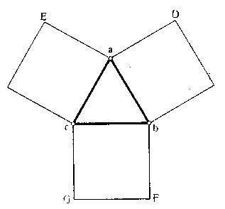 Суть цієї теореми поясню на прикладі за допомогою намальованої фігури. Нехай нам дано прямокутний трикутник, abc, прямий кут якого є а, а сторони, що його, обмежують, — ab і ас. Сторона, проведена проти цього прямого кута, є cb. Отже, Евклід твердить, що коли на всіх сторонах цього трикутника накреслити квадрати, як ми накреслили тут, то квадрат, побудований на стороні, що лежить проти прямого кута, буде рівний /49/ тим обом, які побудовані на сторонах, що обмежують той самий прямий кут. Як тут: квадрат cbFG рівний квадратам abd і асЕ. Будемо вважати це достатньо точним і без доказів.
