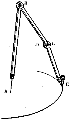 Одна ніжка циркуля — А — гостра й звичайна, а на другій — С можна вирізати невеличке заглиблення, що є ніби вмістилищем для фарби або чорнила, що наносяться на креслення. Але зручніше буде користуватися цим інструментом, якщо одну частину ніжки ми зробимо з гнучкого матеріалу, а саме — частину від вістря С до точки D, а другу частину — з твердого й міцного матеріалу, а саме — від точки Е до голівки В. І ці дві частини треба з’єднати так, щоб гнучка частина не могла відірватися від твердої, але щоб, обертаючись, вони могли трохи відходити одна від одної. Щоб послабити чи посинити це обертання, в точці Е з бічної с.торони вставляють міцний гвинтик D: якщо його повернути в один бік, він закріпляє рухому ніжку циркуля; якщо в другий — послаблює її. Застосовувати це обертання слід тоді, коли треба трохи збільшити або зменшити коло.