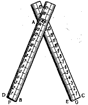 Можна також приладнати до боку більшої планки, подібно до того, як ми це робили при виготовленні попереднього інструмента, мідну дощечку або платівку, яка б не дуже щільно прилягала до планки й вільно поверталася. І вона хай служить виском. Ніжка більшої планки А має закінчуватися залізним вістрям, щоб її можна було встромляти в землю. Цей інструмент використовується для вимірювання будь-яких висот, а також для вимірювання не дуже великих відстаней. Вважають, що його назвали Андріївським хрестам через форму: адже він складається з двох схрещених планок, як і палиця Якова, але краще було б називати його Христовим хрестом [рис. 11].