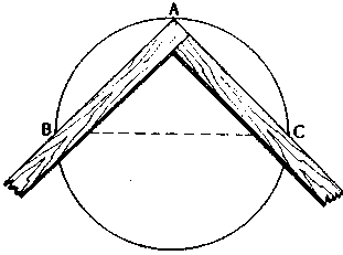5. Косинець — це інструмент, за допомогою якого дуже зручно креслити перпендикулярні лінії або прямі кути, що, власне, робиться так само. А оскільки ми вже говорили про те, що у півколі можна побудувати лише прямий кут, то звідси й випливає найпростіший опосіб побудови косинця, а також перевірка правильності цієї побудови [рис. 4]. Бо \170\ якщо ти візьмеш дві лінійки — АВ й АС, зроблені з тривкого матеріалу, й прикладеш одну до одної так, що сторона однієї — АВ пройде через крайню точку діаметра B, а сторона другої — АС пройде через другу крайню точку діаметра — C, то від цього самого поєднання двох лінійок, якщо лише вершина кута А збіжиться з будь-якою точкою А на дузі кола, /92/ в тебе утвориться точний і досконалий косинець. Тим самим способом ти можеш перевірити, чи правильно зроблений косинець, хоч це можна виконати також й іншим шляхом.