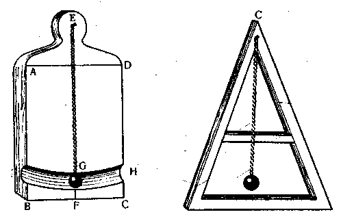 6. Висок — це інструмент, що вживається не для креслення перпендикулярних ліній, як дехто помилково вважає, а для перевірки правильності й точності цих ліній, — і це його перше й основне призначення. А друге, похідне призначення — це перевірка правильності також і горизонтальних ліній. Виготовляється висок приблизно так: з міцного матеріалу роблять дощечку, що має форму паралелограма ABCD, всі кути і сторони якого абсолютно прямі (правда, верхня його частина може мати довільну форму) [рис. 5]. Потім через його середину проводять пряму EF, паралельну до сторони АВ чи до сторони DC, яка через це є перпендикулярам до основи ВС. Біля основи ВС видовбують фігуру будь-якої форми, наприклад Н. І, нарешті, від точки Е опускають прив’язану до нитки олов’яну кульку G, яка вільно обертається на видовбаній частині паралелограма. Ось і маєш цілком готовий інструмент.