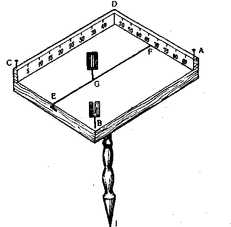 Отже, на тривкій платівці або на дощечці будь-якої величини треба накреслити квадрат так, як було запропоновано [рис. 9]. Посередині нижньої поверхні цієї дощечки треба \175\ приладнати видовбану завісу, в яку б легко встановлювалася верхня частина застромленої в землю ніжки, про яку ми зараз розповімо.