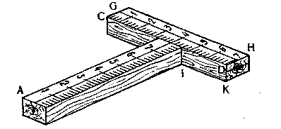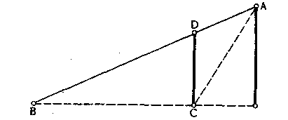 Виготовлення Андріївського хреста. Візьми дві прямі планочки неоднакової довжини — АВ й CD і так \177\ прибий цвяшком меншу планку CD до більшої АВ або встроми одну в одну, зробивши довгастий отвір, щоб вона могла рухатися вперед і назад за твоїм бажанням, залежно від потреби, але щоб вона сама собою випадково не посунулася, куди не слід. Ти бачиш це на даному малюнку. На цьому інструменті нічого не треба писати, лише для зручності більшу планку АВ можна розділити, починаючи знизу, на декілька рівних частин і ці частини позначити цифрами, які мають бути написані й під рухомою планкою, і над нею.