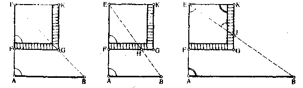 Хай нам треба виміряти відстань між пунктами А й В. Виконуй це у такий спосіб: розмісти квадрат, поставлений на ніжку у пункті A так, щоб площина його була паралельною до лінії горизонту, й поверни сторону AC в напрямку до точки В. Приладнавши до цієї сторони АС Лінійку з діоптрами, слідкуй за кінцем B, а потім, залишивши квадрат в тому самому положенні, не зрушуючи його з місця, прилаштуй лінійку з діоптрами до сторони А й через діоптри спостерігай будь-яку позначку /97зв./ E, що відстоїть від A на декілька п’ядей. Зробивши це, встроми кілок або якусь іншу позначку в точку A і перемісти квадрат з точки A в точку E, звідки знов через ту саму сторону AD поглянь на кілок A, повертаючи квадрат то туди, то сюди, поки промінь від сторони AD не впаде на згаданий кілок. Потім, закріпивши інструмент, спрямуй лінійку з діоптрами від центра A до кінцевої точки B, доки не побачиш її крізь діоптри. А щоб лінійка не зсувашася з центра A, треба встромити в центрі голочку й до неї прикласти лінійку тим боком, на якому розміщені діоптри, як ми вже сказали. Поглянувши у такий \185\ спосіб на кінцеву точку B, не зрушуй лінійку й подивись, де лінійка своїм боком з діоптрами перетне сторони квадрата. Перетнути вона може або в точці G [рис. 15], бо є вершиною кута, або, припустимо, в точці H на стороні FG [рис. 16], або, наприклад, в точці I, що міститься на стороні GK [рис. 17], залежно від того, якою буде відстань точки В від точки А. Хай спочатку точкою перетину буде G, і ми отримуємо лівію EF, що буде ніби стороною квадрата, яка дорівнює стороні FG. Таким чином, лінія ЕА — відстань від початкового пункту до АВ — дорівнює шуканій відстані кінцевої точки.