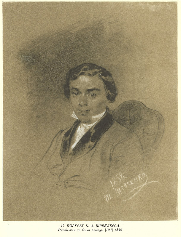 10 січня 1858 р. Шевченко записав у щоденнику: «Нарисовал портрет Шрейдерса, и довольно удачно. Часть долга, значит, уплачена. Нужно еще нарисовать /15/ Фрейлиха и Кадинского 1, и тогда квиты» (див. т. V, стор. 137). Див. також портрети А. К. Кадницького (№ 21), М. А. Фреліха (№ 22) та примітки до них. Попередні місця збереження: власність К. А. Шрейдерса, П. й. Морозова, О. П. Новицького, Бібліотека ім. Леніна в Москві, ІТШ, ГКШ.
